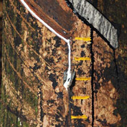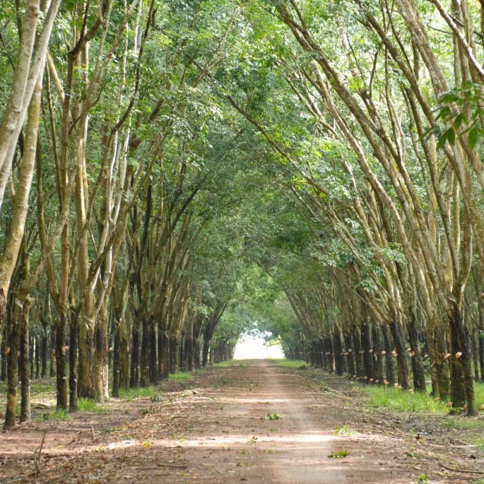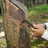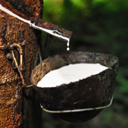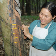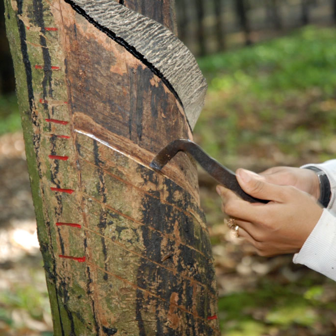 人们通过在树皮上切出细小的切口来获取橡胶树液。